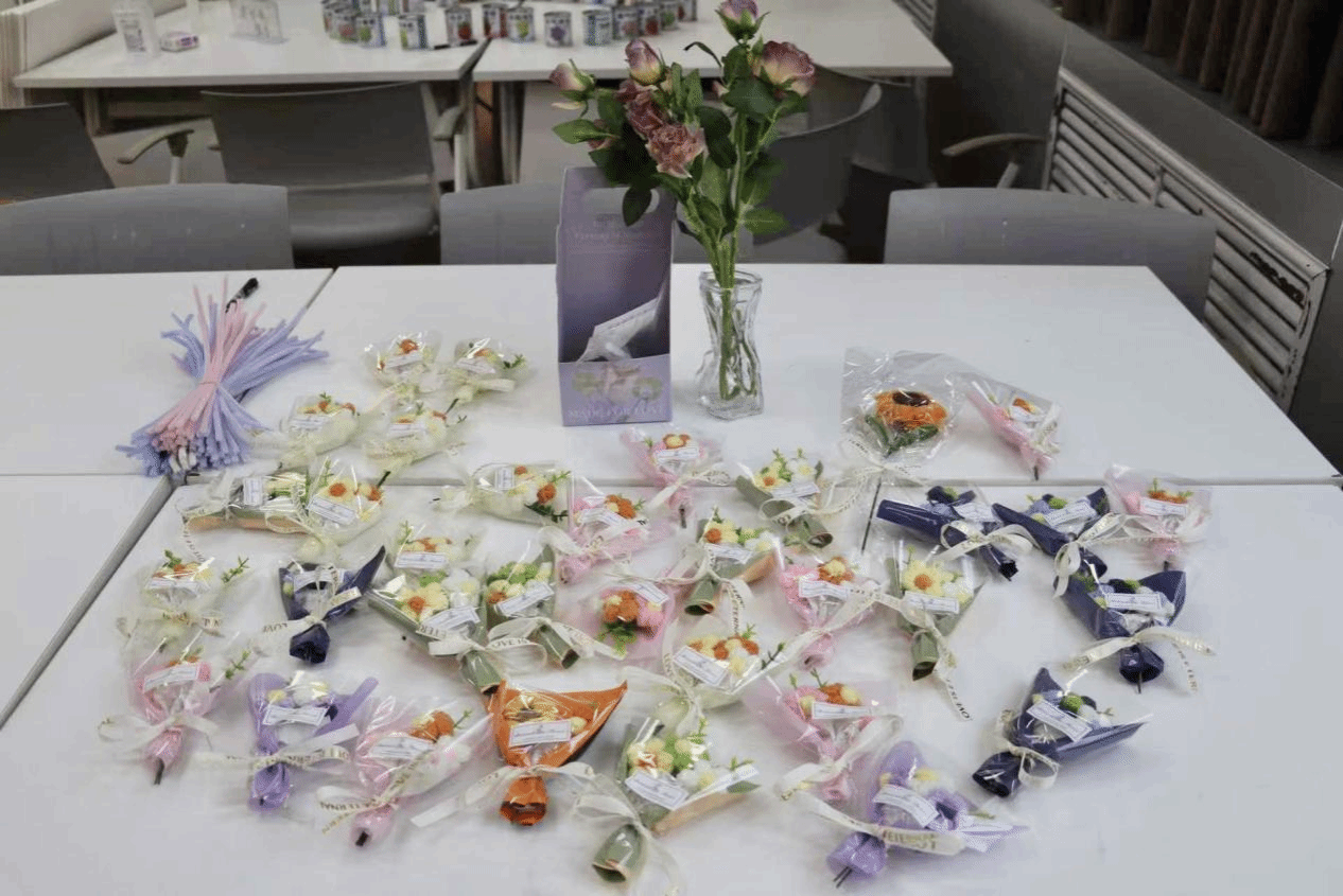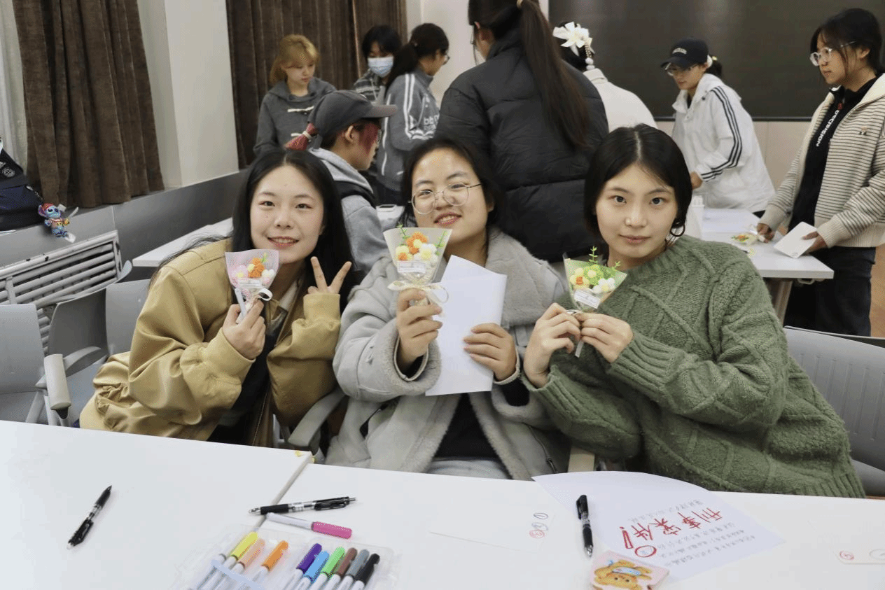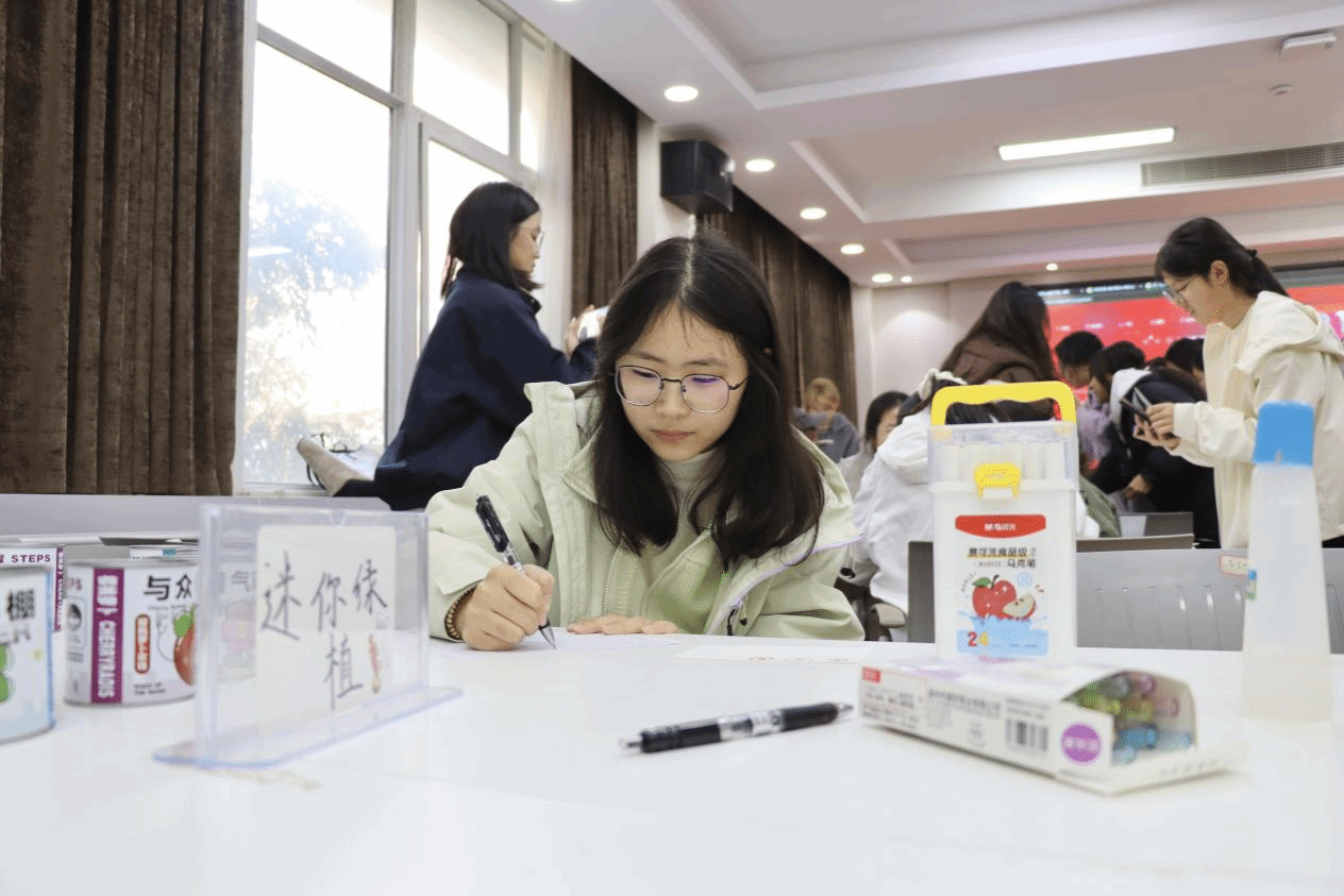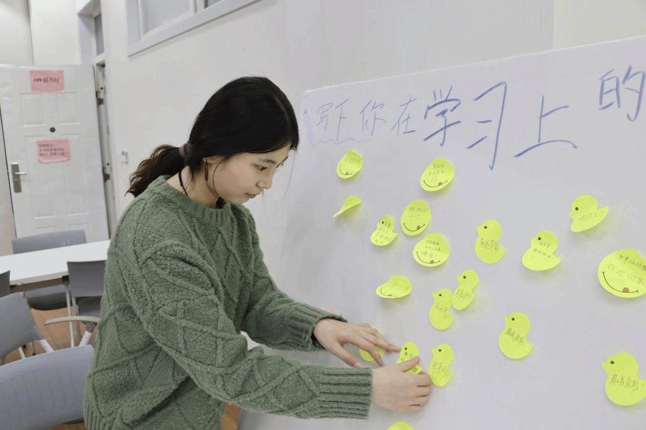 活动当天,现场气氛热烈,同学们参与踊跃。“心灵丝带墙”前,同学们凝神静思,郑重写下对未来的期许;“学习脑暴工作坊”中,各组围绕“学业困惑树”展开热烈讨论,在思维碰撞中寻找解决方案;“绘画区域”色彩斑斓,同学们笔下的理想大学生活充满了创意与憧憬;“以花换故事” 的角落则温情流动,书写与阅读的瞬间承载着情感的共鸣与陌生的善意。此外,“循环自我介绍”的欢声笑语与“迷你绿植”种植时的专注耐心,共同交织成一幅生动而温暖的画面。整个109教室化身为一个充满正能量与支持感的心理空间,同学们在亲身体验中收获了心灵的成长与温暖的陪伴。
