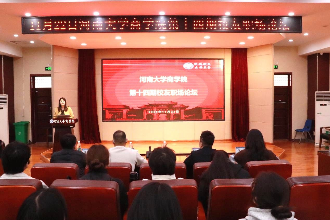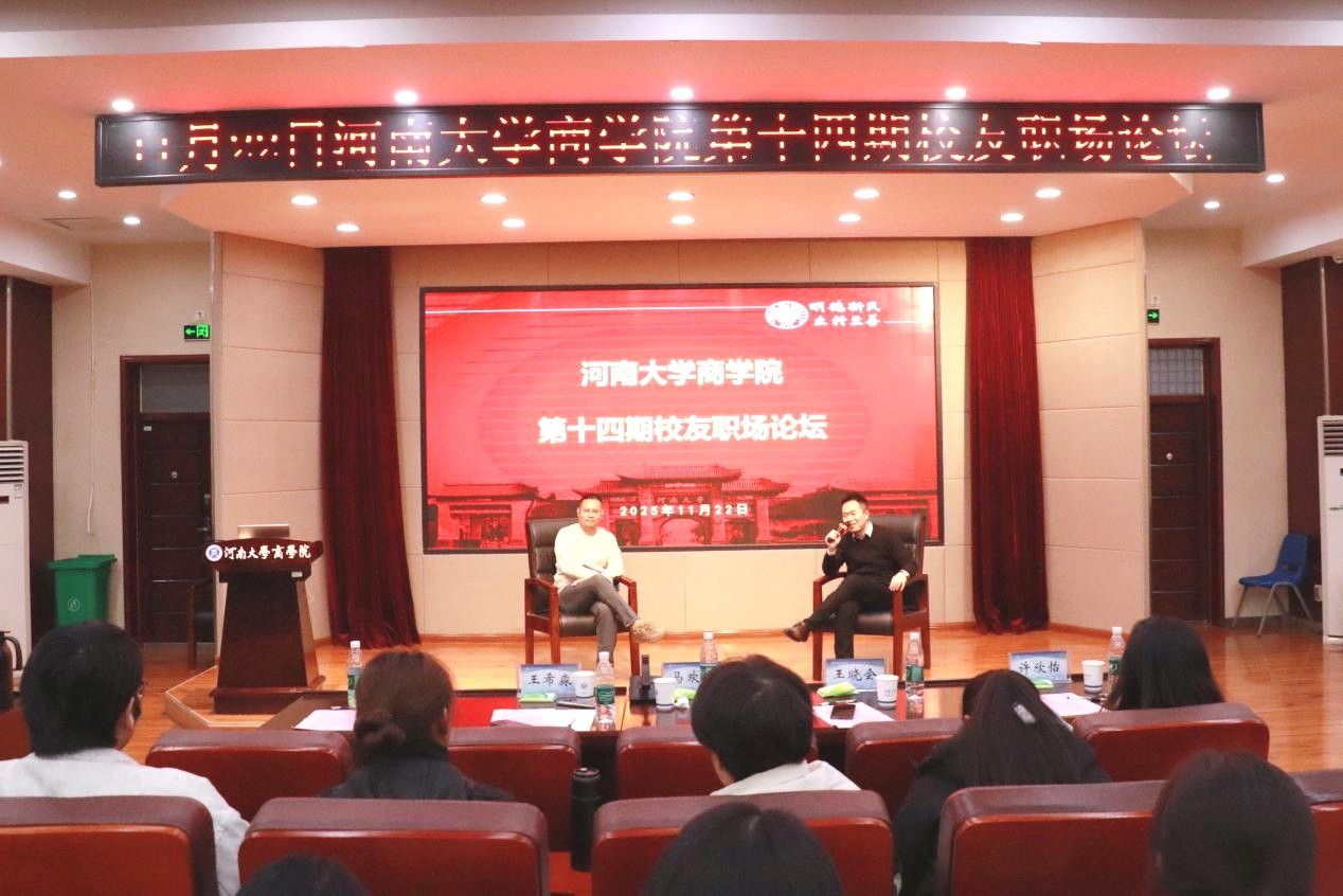 为助力学生拓展职业视野、积累创业与就业经验,11月22日下午,河南大学商学院于学院二楼学术报告厅顺利举办第十四期校友职场论坛。本期论坛以“互联网创业成才进阶之路”为主题,特邀2003级工商管理专业校友王希淼、电子商务专业校友王晓会重返母校,分享职场心得与创业体会。国内合作办公室主任韩焕法、团委负责人聂大开、2025级辅导员许欣怡出席论坛。本次论坛由商学院党委副书记马欢欢主持。