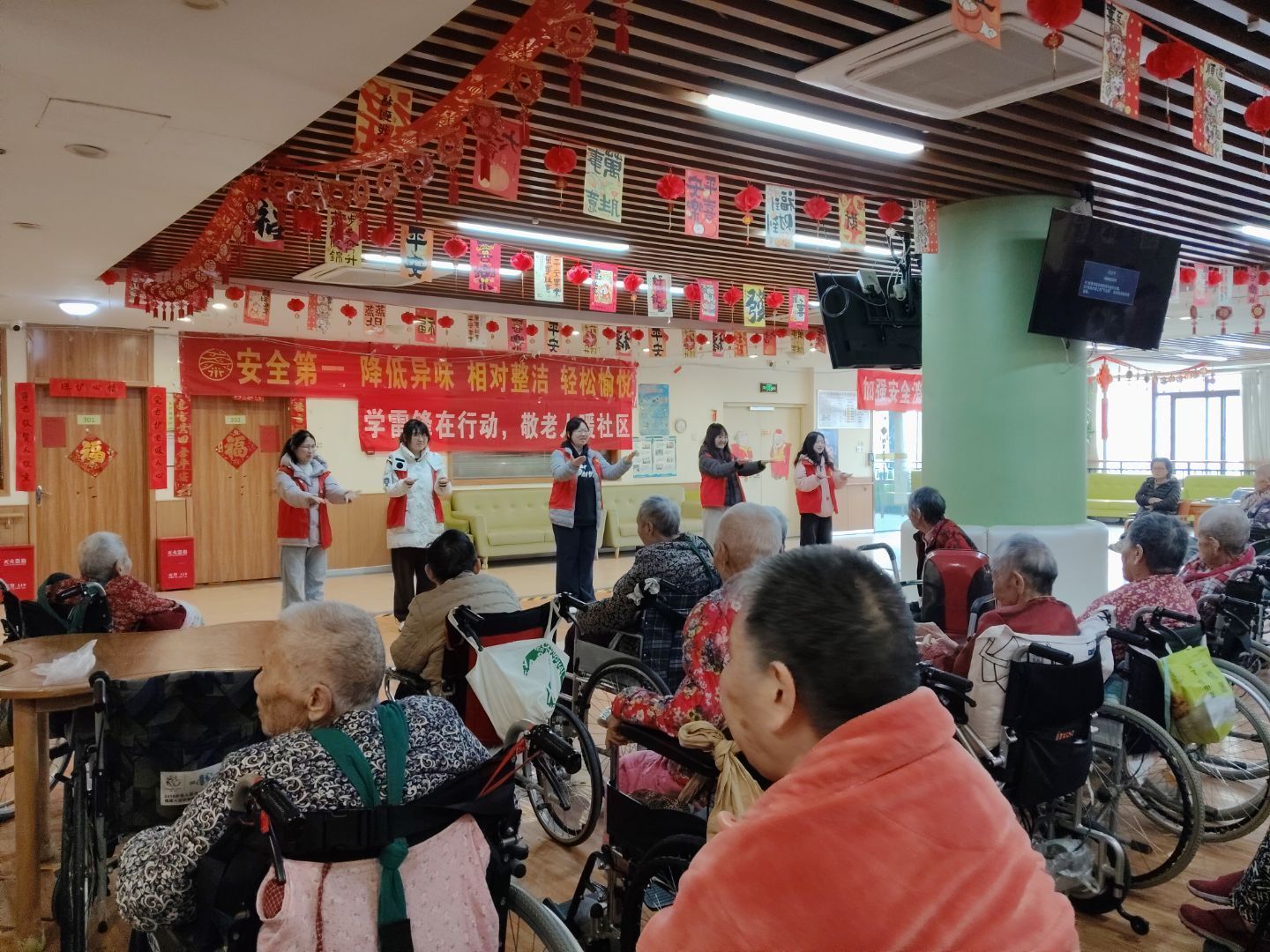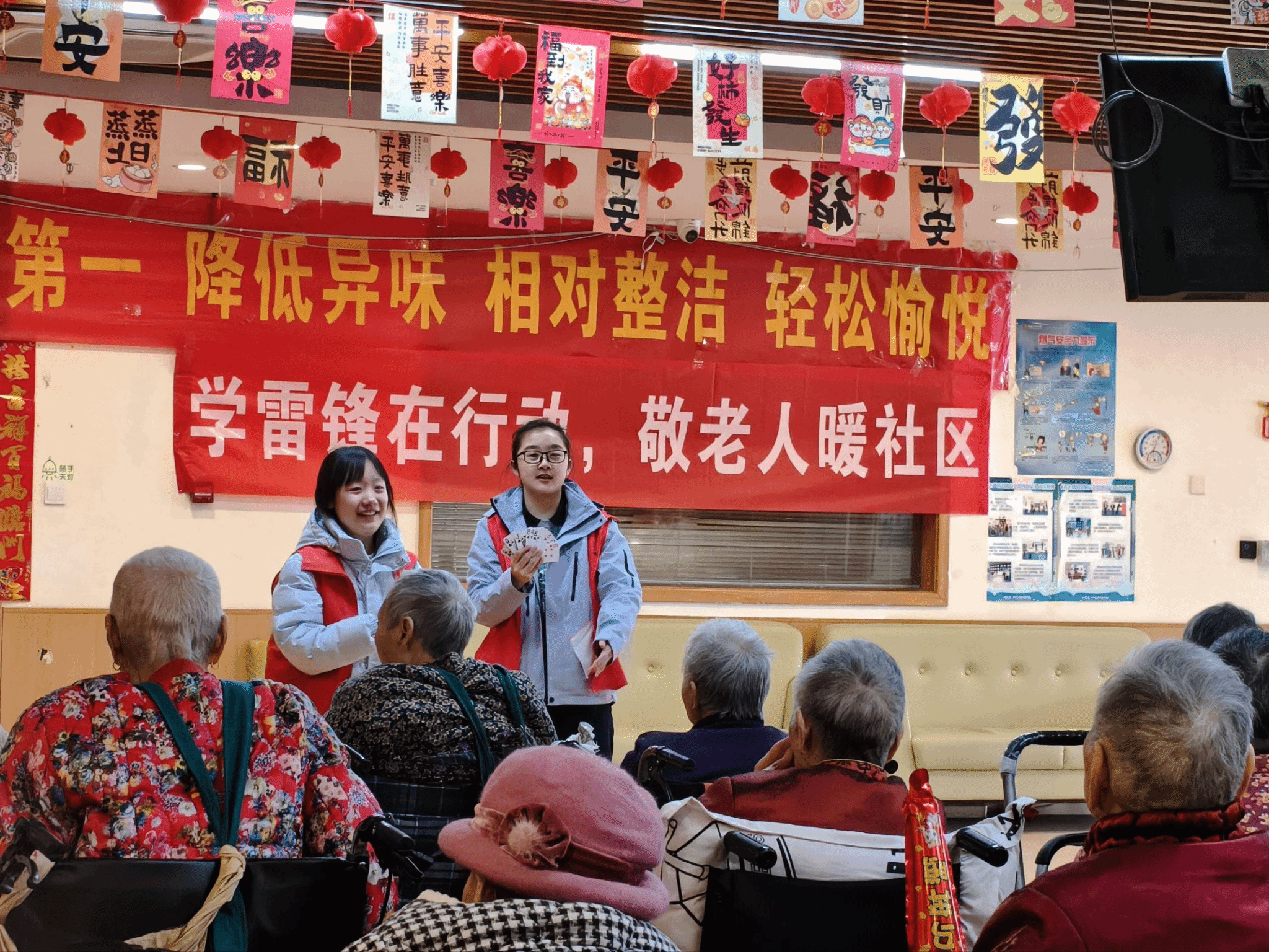活动伊始,一场精心筹备的小型文艺演出拉开帷幕,成为连接青年与长者的温暖纽带。志愿者们带来形式多样的精彩节目,温情洋溢的歌曲合唱轮番上演,《明天会更好》《最炫民族风》《桃花朵朵开》等经典旋律在现场回荡,熟悉的曲调瞬间勾起长者们的美好回忆,不少老人跟着节奏轻声哼唱,现场气氛温馨热烈。