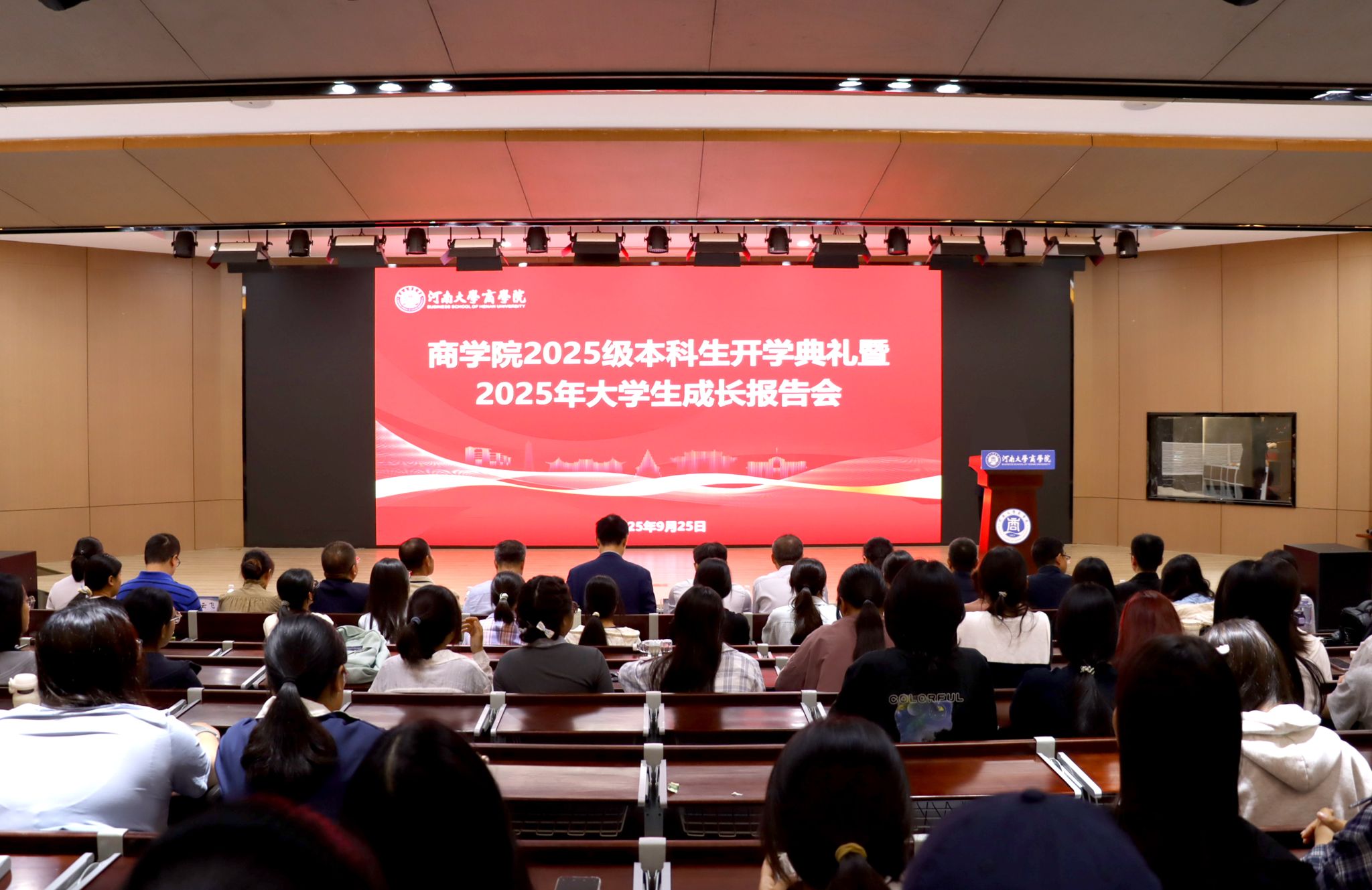 金秋迎新知,商院启新篇。2025年9月25日下午,河南大学商学院2025级本科生开学典礼暨2025年大学生成长报告会在金明校区圆形报告厅二楼举行。学院领导班子成员、各系室负责人、教师代表与263名本科新生齐聚一堂,共同开启大学新篇章。典礼由院党委副书记马欢欢主持。