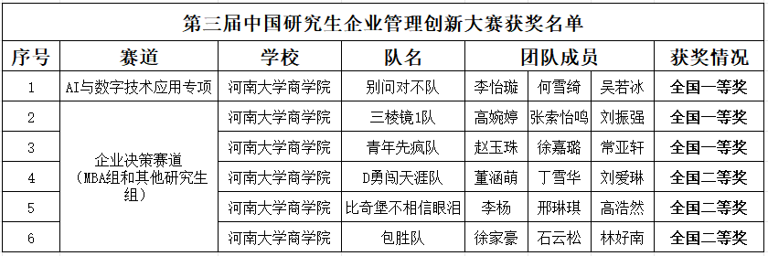 此次赛事的丰硕成果,既是对商学院研究生培养质量的检验,也充分彰显了学科竞赛育人体系的建设成效。未来,河南大学商学院将继续以“自信、拼搏、开放、创新”的新河大精神为指引,恪守“明德弘道,商善天下”的院训,持续深化研究生创新实践平台建设,着力培育具备系统专业能力与创新应用素养的高素质管理人才,为服务学科建设与高质量发展提供坚实人才支撑。