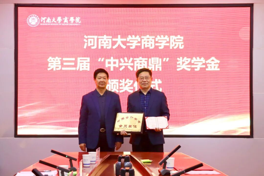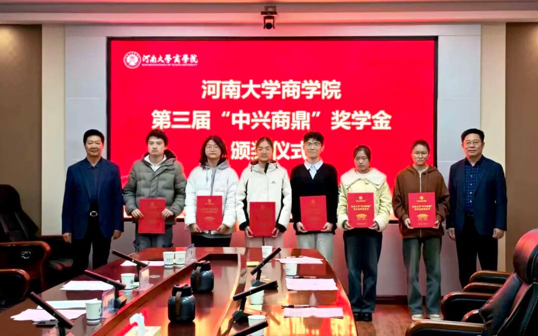 2025年11月28日下午,河南大学商学院在201会议室隆重举行第三届“中兴商鼎”奖学金颁奖仪式。奖学金捐赠人、商学院荣休教师刘建中,商学院党委书记左辞波,河南大学教育发展基金会办公室副主任高欢,商学院党委副书记马欢欢,会计系党支部书记杜建华,会计系教师代表,学院相关科室负责人及辅导员参加颁奖仪式。仪式由马欢欢主持。