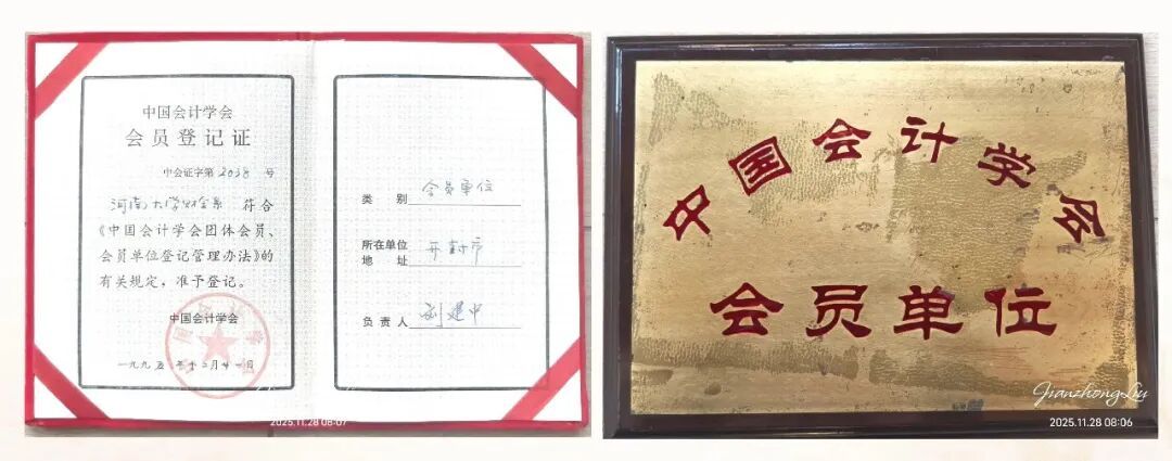 仪式过程中,刘建中将自己珍藏的1995年中国会计学会会员登记证与纪念牌赠予学院,这份承载着会计学科发展记忆的物件,既是他数十载深耕会计领域的见证,也饱含着对学院学科建设与人才培养的深切期许,象征着学术精神的接续与师道传统的延续,将现场气氛推向高潮。左辞波代表学院接受赠予,并向刘建中致以崇高敬意。