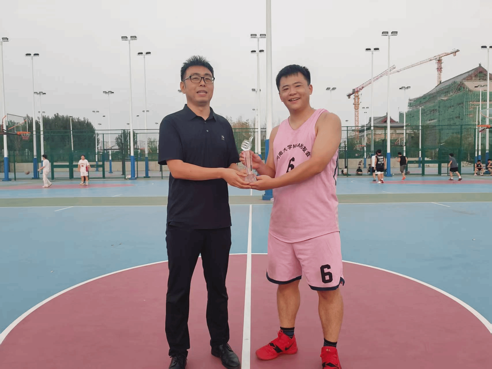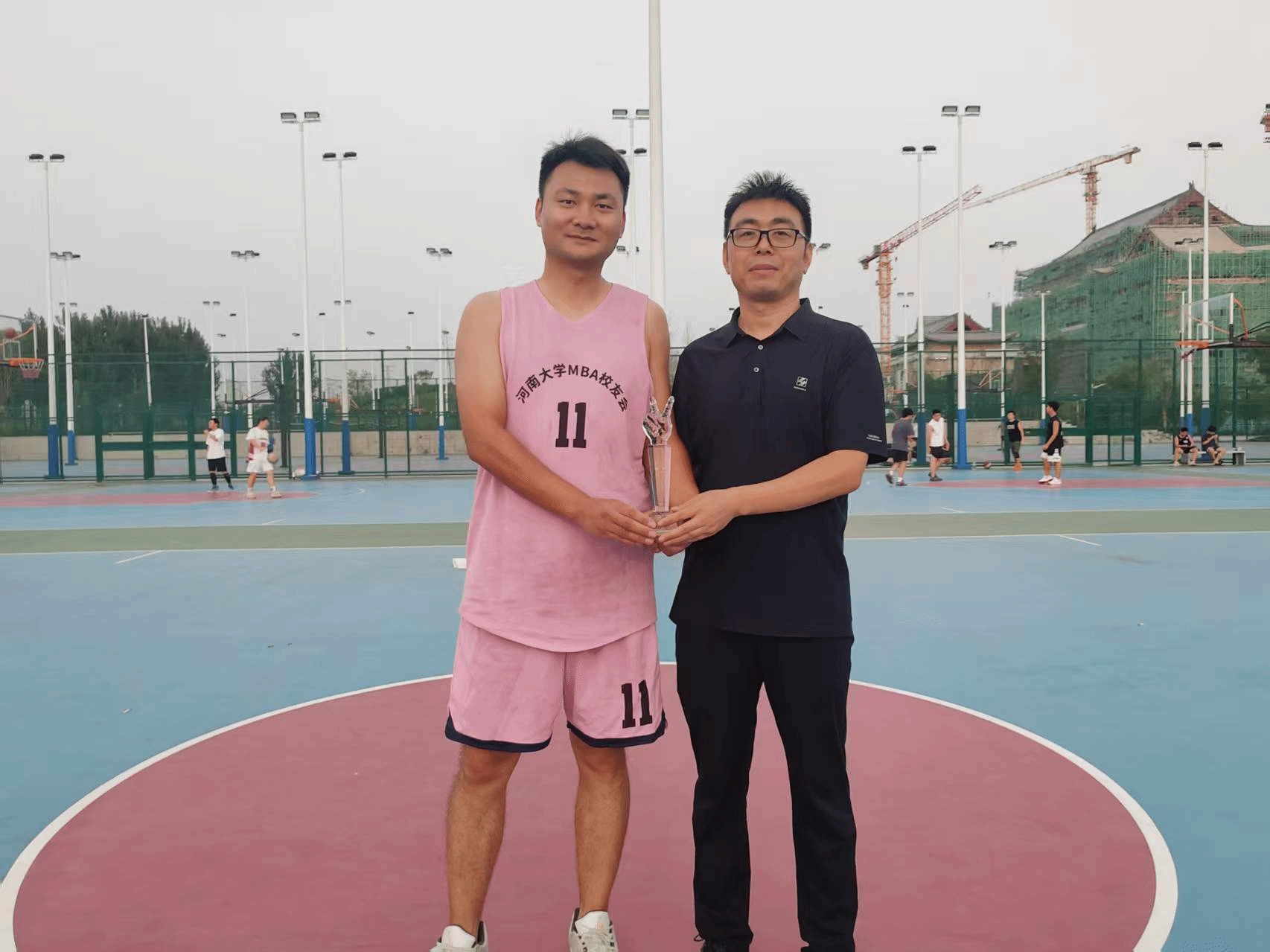 随后进入颁奖环节,2022 级 MBA 校友刘佩主持,河南大学 MBA 校友会副会长王延胜颁奖。“在校生队” 获定制冠军奖杯及纪念品,“毕业生队” 获亚军奖杯及纪念品;24 级沈思远凭三分能力与得分表现,获 “最有价值球员(MVP)” 及奖杯。王延胜表示,赛事展现了 MBA 学子的拼搏与团队精神,未来校友会将建更多互动平台,助力校友深化情谊、促进职业发展。